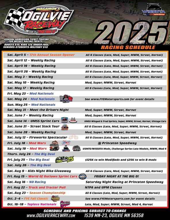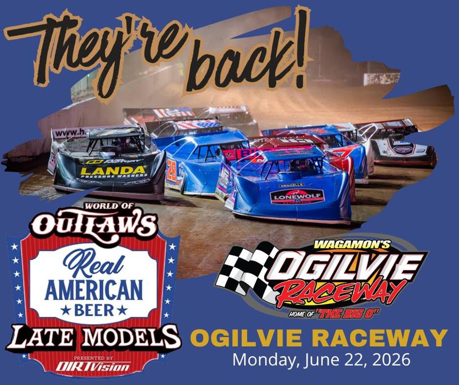 World of Outlaws Late Models return to Ogilvie Raceway, Monday, June 22, 2026. Reserved Seat Tickets will go on Sale Soon!