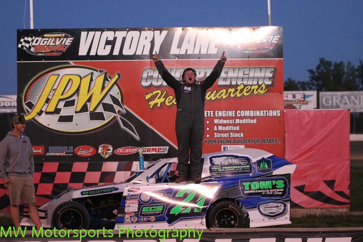 Kyle Howland and Levi Randt led the WISSOTA Streets to the green, and Randt claimed the immediate lead. Tommy Pogones slid in behind Randt as the top two drivers separated from the pack. Pogones moved next to Randt and quickly took the lead as they spaced out. Pogones set the cruise control and cruised around the Big O with Randt in a solid second. Thomas Worth and Howland battled for third lap after lap while the top two drivers drove away. Tommy Pogones had a lead of 5.35 seconds over his competition as he took this third straight feature win at Ogilvie while Levi Randt, Kyle Howland, Thomas Worth and Charlie Shiek rounded out the top points.