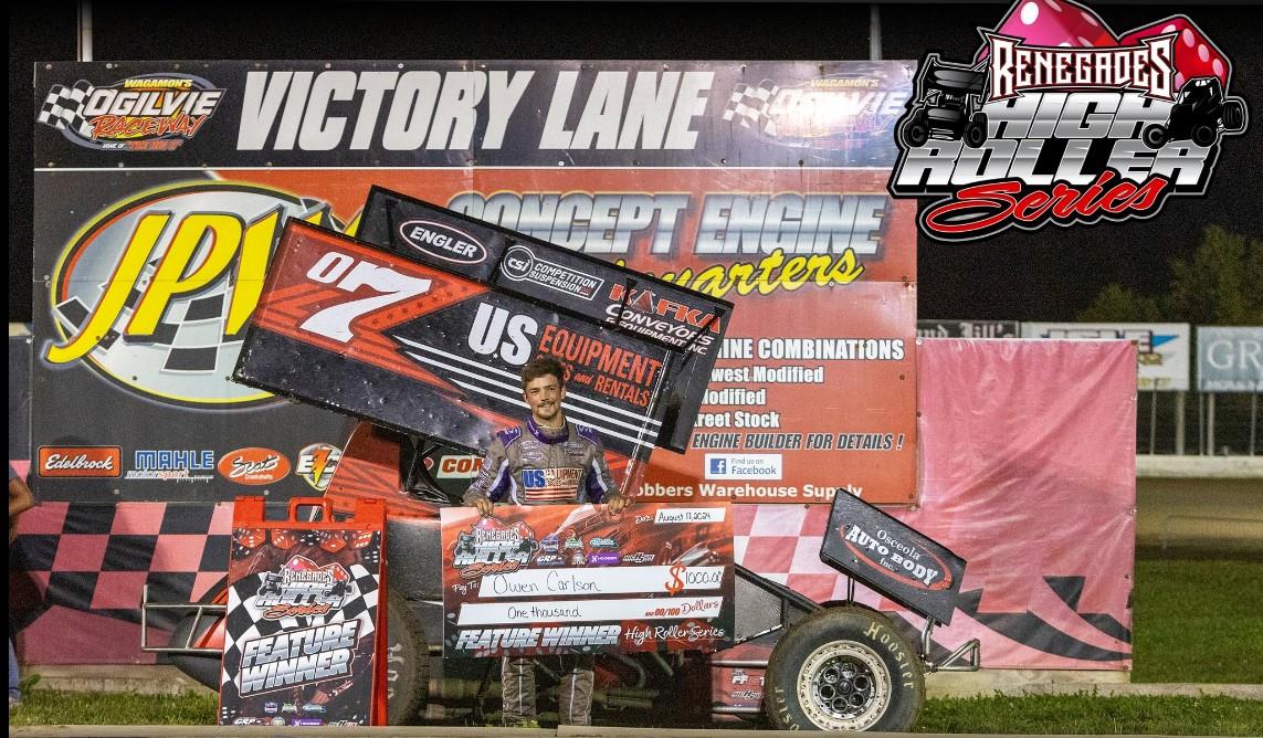 Ogilvie, MN (August 17) – The High Roller Sprint car series stopped by Ogilvie Raceway on Saturday night with both the Winged and Non-Winged cars in attendance. The WISSOTA Midwest Modifieds, Modifieds, Mod Fours and Hornets were also on the order of events for some WISSOTA Dirt Track Race Action and Jason VandeKamp, Bobie Arnes, Tyler Larson and Jack Rivord grabbed wins.